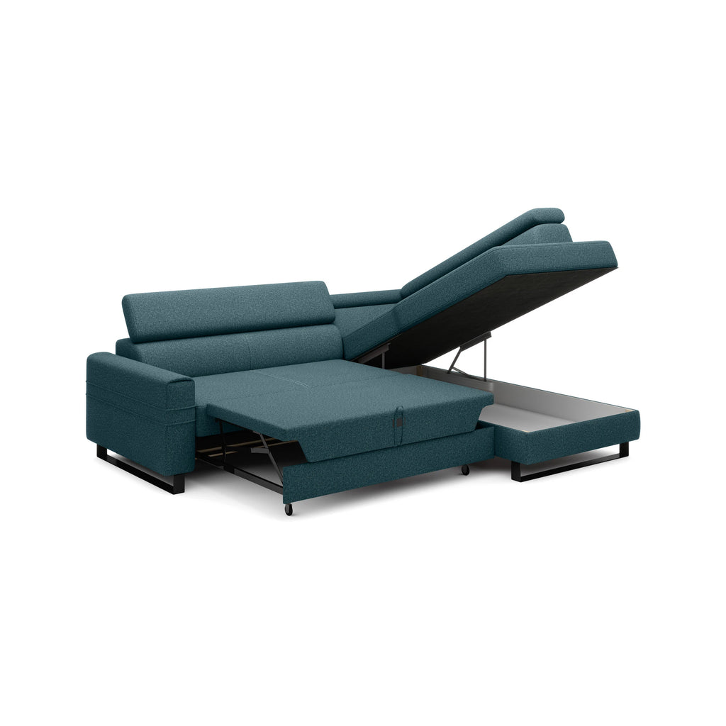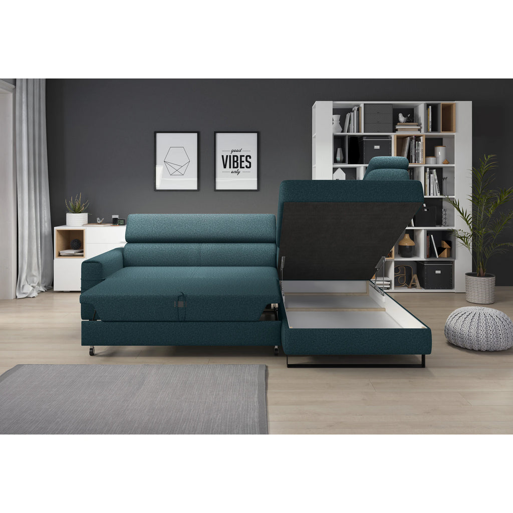 Coltar extensibil LIVIO, personalizabil materiale gama Oferta Avantaj, cu lada depozitare si tetiere reglabile, 249x184x90 cm