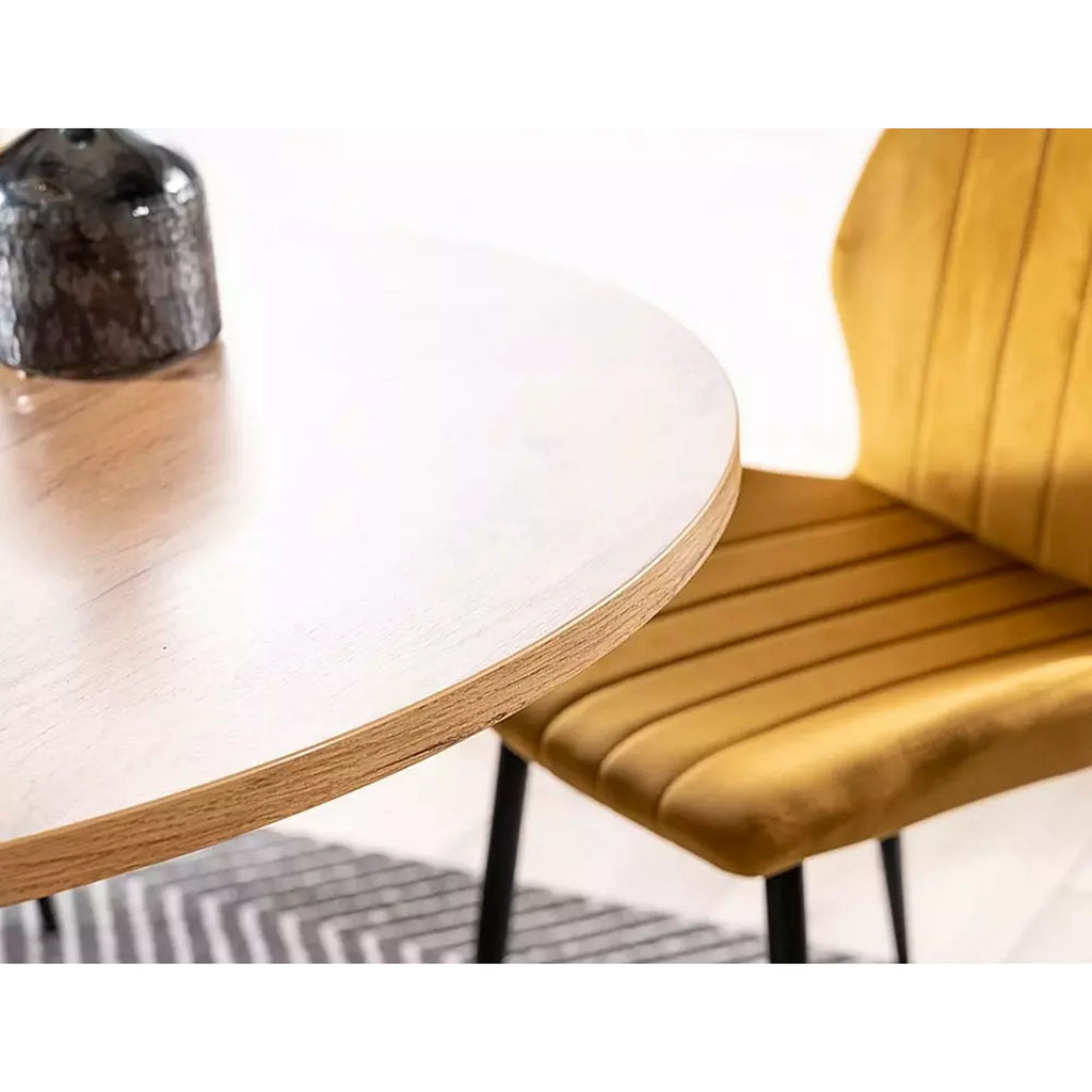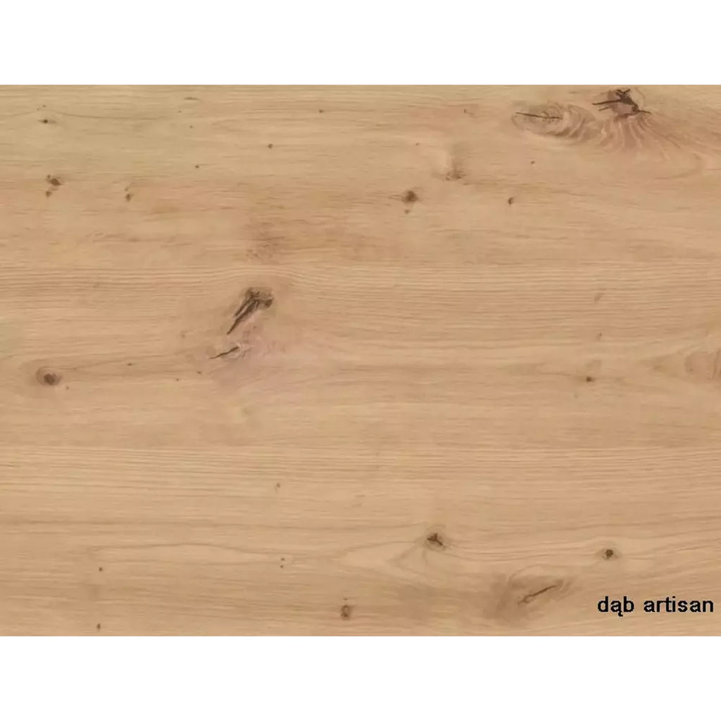 Blatul are finisaj in nuanta stejar, cu textura vizibila ce reproduce aspectul natural al lemnului. Suprafata este plana si uniforma, potrivita pentru utilizare constanta in zona de dining.