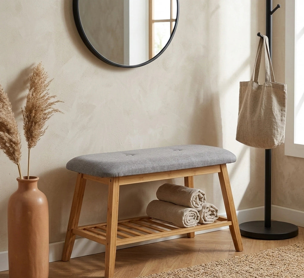 Pantofar ST14, gri/stejar natural, stofa/lemn de bambus, 60x30x44 cm