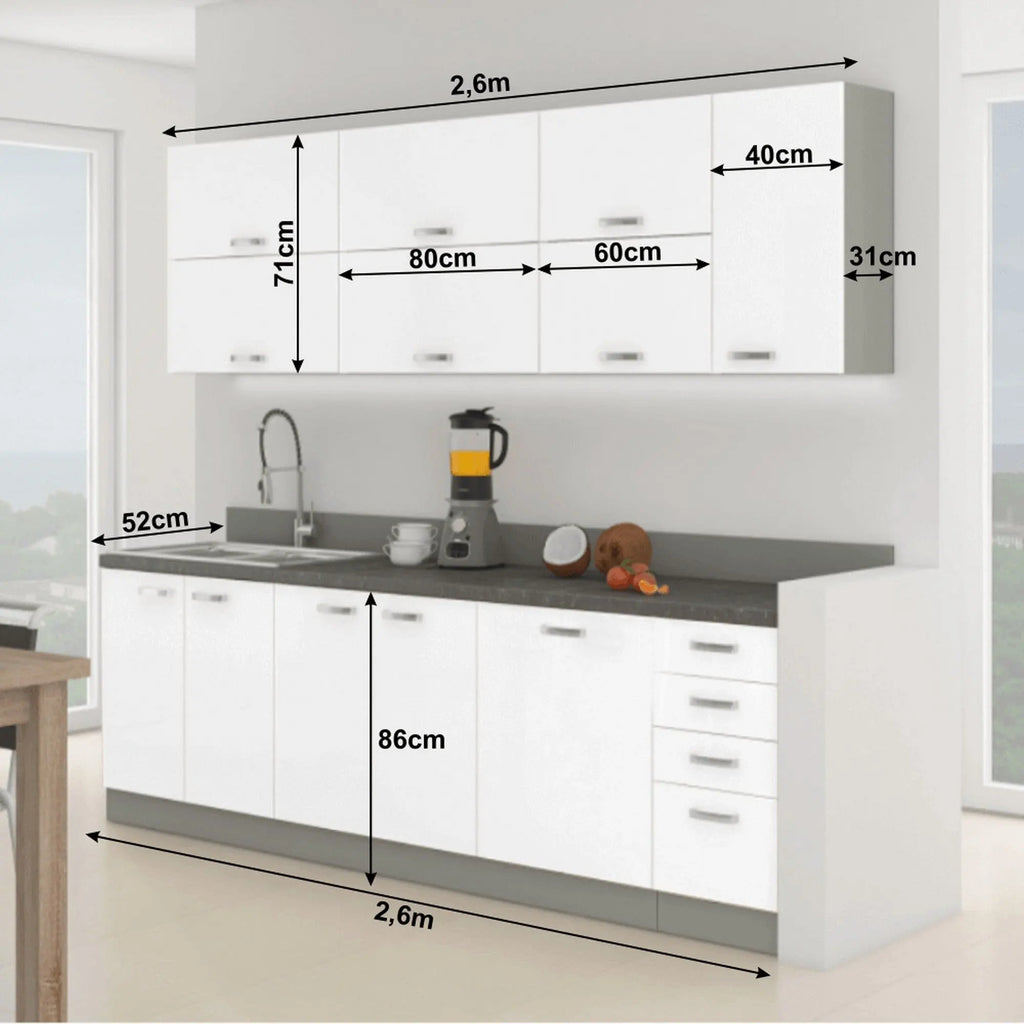 Set bucatarie PRADO, alb lucios/gri/gri cu efect de marmura, PAL melaminat, 260 cm