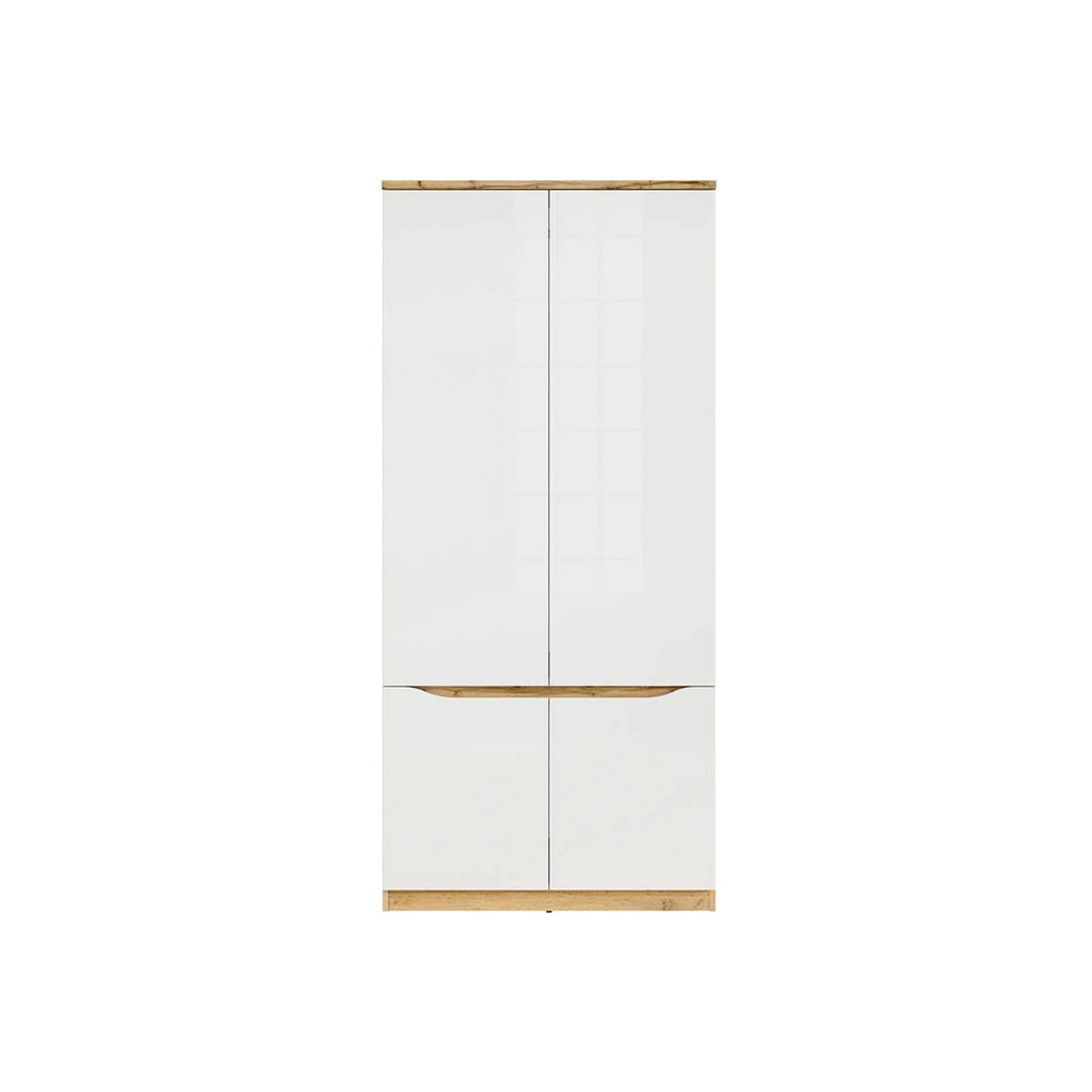 Dulap 90 NUIS, alb lucios/stejar wotan, PAL laminat, cu 4 usi, 90x58x198 cm